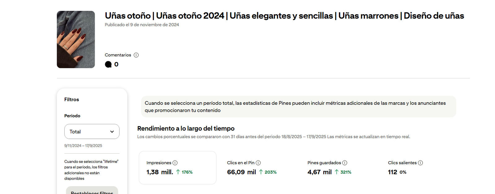 Posteriormente, seguí subiendo pines a Pinterest, hasta que descubrí “Espacio para empresas”, una función donde puedes ver las tendencias actuales, las interacciones e impresiones que tienen, cómo han ido creciendo durante el tiempo y, además, una previsión de lo que será tendencia dentro de poco tiempo. Me puse a buscar qué estaba en tendencia en esos momentos; entre ellos vi que uno de los temas más virales eran los esmaltes de uñas. Así que reciclé una foto del propio Pinterest y la publiqué, junto a las palabras clave necesarias y sus temas relacionados. Entonces fue cuando empezó la magia. Las métricas no paraban de subir, y hasta hoy, todos los días recibo interacciones en esta publicación.